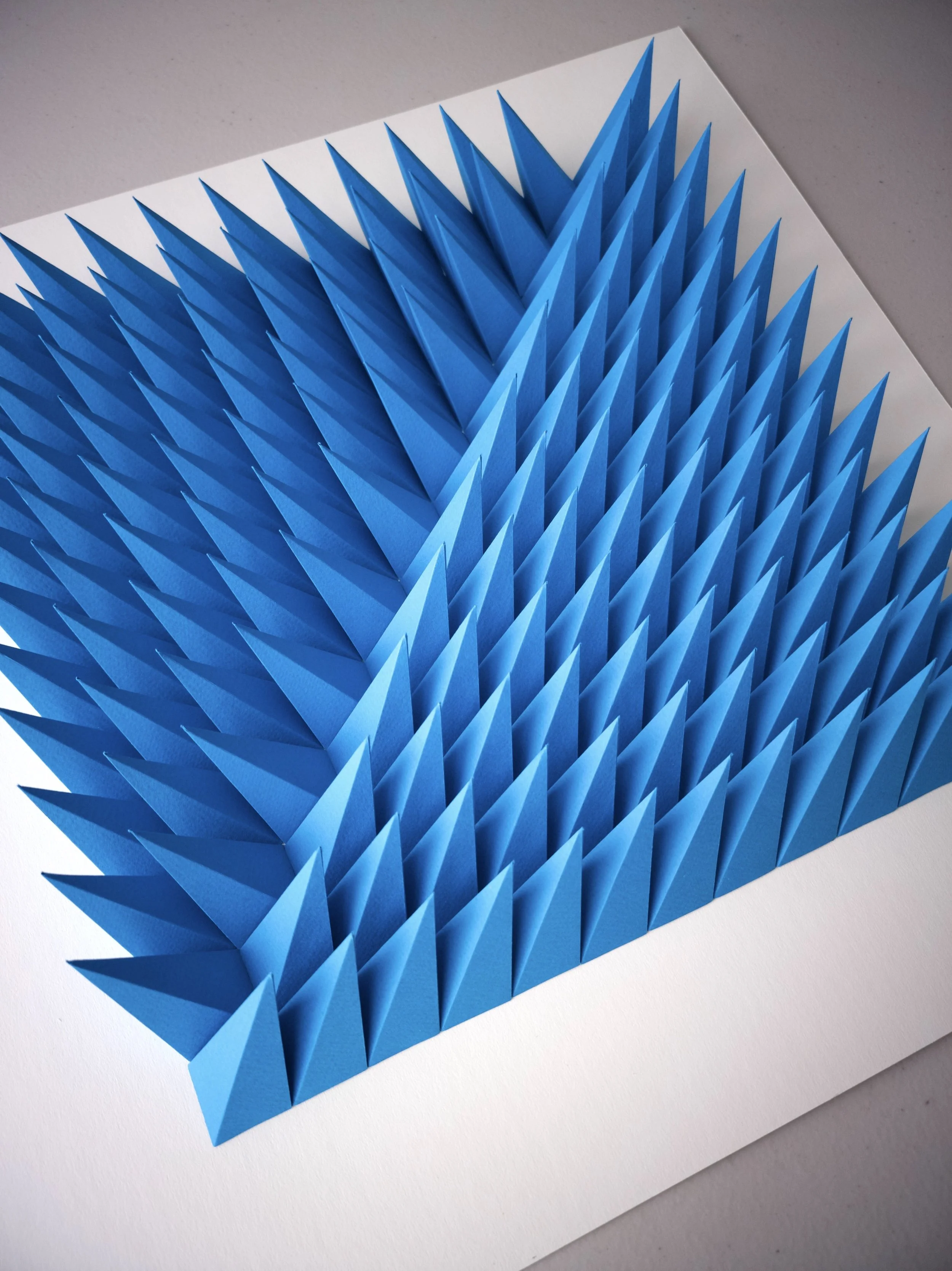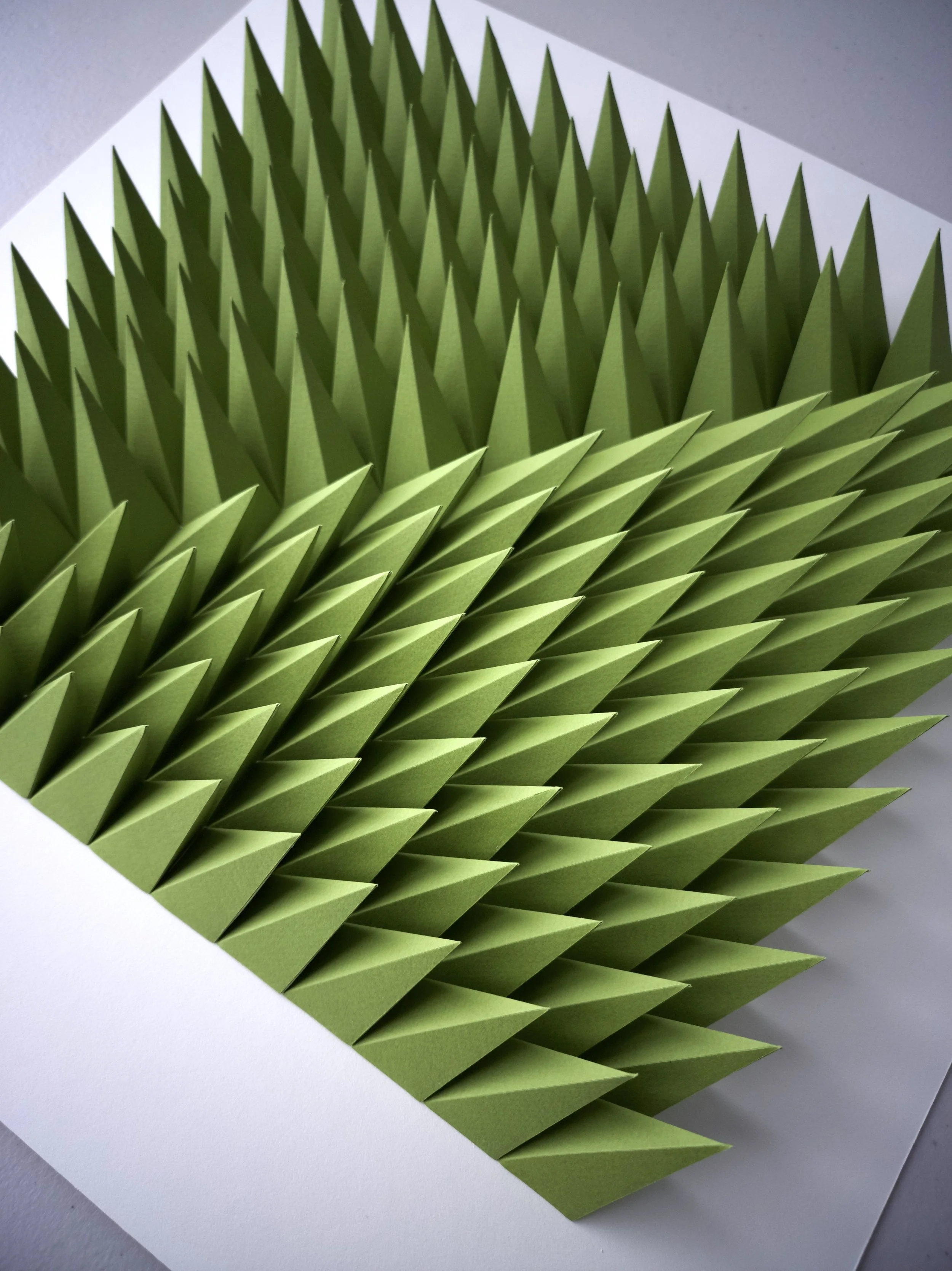 A myriad of mostly triangular paper pieces are made to look like a modern kaleidoscope.